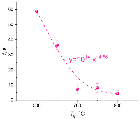 Figure 3 shows the thermal decomposition times of a CO2 hydrate tablet when varying the ambient gas temperature in the range of 500–900 °C. The error bars in the figure illustrate the random error in a series of measurements of thermal decomposition time (confidence intervals). To process the results (including gross error identification and elimination), standard approaches were used [39]. These involved calculating the mathematical expectation (Equation (1)), variance of a random variable (Equation (2)), and standard deviation for each series (Equation (3)). Then the width of the error bars was calculated (Equation (4)).