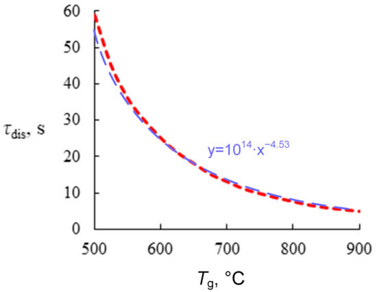 where Y is the degree of carbon dioxide hydrate particle conversion to ice, parameter parameter R0 is the radius of the sphere, kR and kF are the kinetic and filtration coefficients, ρH is the CO2 hydrate density, b is the initial carbon dioxide concentration C0, µ is the dynamic viscosity of gas, pEq is the equilibrium pressure in the CO2 hydrate, D0 is particle diameter and p0 is the ambient pressure. Modeling also involved the calculation of thermal balance controlling for the dissociation, ice melting, and water evaporation [41]. The results of predictive calculations are given in Figure 4. The curve is nonlinear. At above 700 °C, the impact of temperature (slope of the curve) is much lower than in the temperature range under 600 °C. The computational findings are in acceptable agreement with experimental data given in Figure 3.
