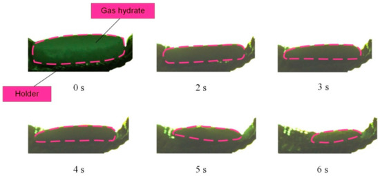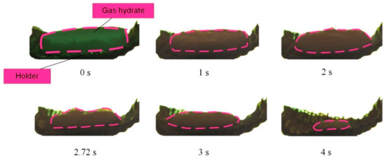 The third pattern is related to a more intense hydrate dissociation in an experimental chamber as compared to typical commercial systems in which hydrates are delivered in layers. Such layers are heated in production units in the same way as in a tubular muffle furnace in the experiments—all around—but substrates for samples have different structures. In the experiments, the hydrate samples were placed on a perforated mesh to make it similar to tablets suspended in a chamber or free-falling granules. Such meshes are often used in commercial production processes. The heat is supplied to the hydrate sample surface through this mesh, and water drains from the surface of a tablet through the mesh as well. With a non-perforated substrate, the heat supply to the lower surface of the hydrate tablet proceeds in a different way, and there is no drainage. In this case, the complete hydrate dissociation will last longer than it was established in this research. It is more efficient to heat hydrate granules and tablets from all sides and let water drain from their surface. This will minimize the self-preservation of hydrate pores, thus accelerating hydrate decomposition and gas dissociation.