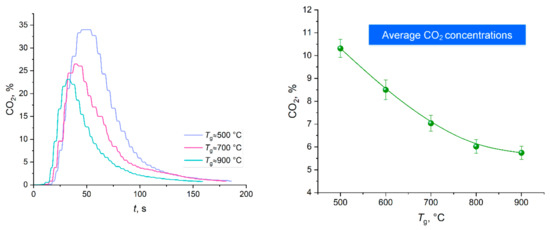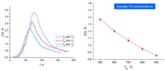 Water vapor is known to reduce the harmful emissions from the combustion of a wide range of materials and substances, which is important from the environmental perspective. Compartment fires involve various materials and produce a large amount of anthropogenic emissions that are harmful to respiratory organs. That is why it is important to evaluate how water and temperature of the gas environment temperature affect the concentration of emissions. Water is formed when gas hydrate decomposes and ice melts at a high ambient temperature. Figure 8 and Figure 9 show the measured concentrations of CO2 and CO emitted during the thermal decomposition of carbon dioxide hydrate. The error bars given in Figure 8 and Figure 9 (on the right) were calculated according to the procedure described in Ref. [39] and illustrate the random error in the average gas component concentration (confidence intervals) in a series of five measurements. As the temperature increases, the gas concentration drops. Both the maximum concentration and the gas release time decrease. An increase in the concentration with a higher ambient temperature stems from a more intense interaction between the decomposition products and water vapor (i.e., radicals responsible for the reactions with carbon are formed more rapidly). A slight increase in the CH4 concentrations was recorded at high temperatures in the furnace (Tg ≥ 700 °C). In particular, the methane concentration was 0.01% at Tg ≈ 700 °C and 0.02% at Tg ≈ 900 °C.