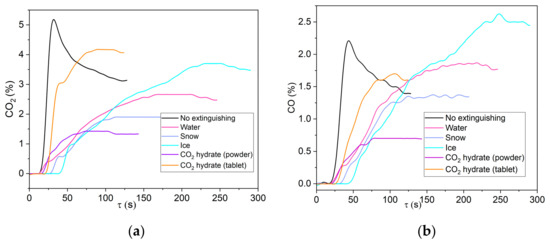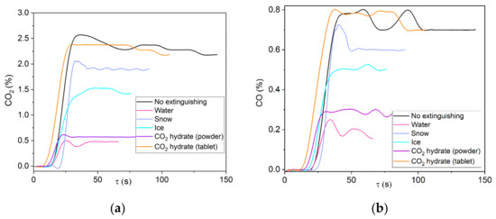 The trends obtained for cardboard (Figure 11) agree overall agree with the data on wood fire suppression. The minimum emissions of carbon oxides were produced during the suppression of a cardboard fire with CO2 hydrate powder. The difference in the threshold concentrations of CO2max and COmax from the combustion of cardboard without suppression and with suppression using CO2 powder was 70%. The maximum gas release time and rather high concentrations of carbon oxides indicate that ice is the least effective extinguishing material of those considered in this research. When used to extinguish burning cardboard, water exhibited lower efficiency in decreasing the CO2 and CO emissions as compared to wood fire suppression (Figure 10). Water quickly evaporated from the cardboard surface and got absorbed into cardboard without penetrating into the depth of the porous cardboard layer, several centimeters high. As a result, pyrolysis continued in the depth, and local combustion continued over the surface of the material.