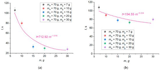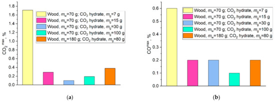 Figure 14a,b shows the curve of the time when the CO2 and CO emissions started to decrease versus the mass of hydrate (mg = 7–30 g) with the mass of wood remaining constant (mw = 70 g). It is clear that the time until the gas concentrations begin to decrease shortens with an increase in the mass of the extinguishing hydrate. A change in the mass of carbon dioxide hydrate from 7 g to 15 g reduces the time until the CO2 and CO concentrations start to go down by 71% and 28%, respectively. An increase in the hydrate mass from 15 g to 30 g leads to a negligible change (up to 10%) in the time before the concentrations begin to decrease. Figure 14a,b presents the approximation curves of the exponential (CO2) and polynomial (CO) nature with the mathematical expressions describing these curves. The resulting mathematical expressions allow the extrapolation to greater masses of extinguishing agents and larger fire areas.