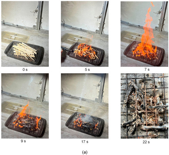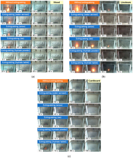 Images of fires (mw ≈ 6 g) based on wood (a), linoleum (b), and cardboard (c) burning without suppression by extinguishing agents as well as after contact with extinguishing agents (water, snow, ice, CO2 hydrate).