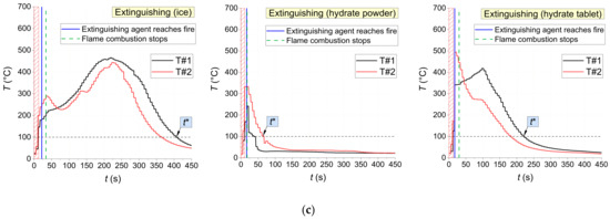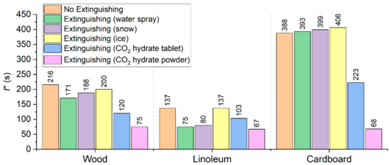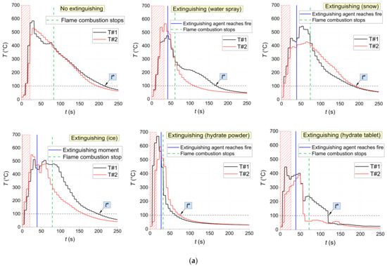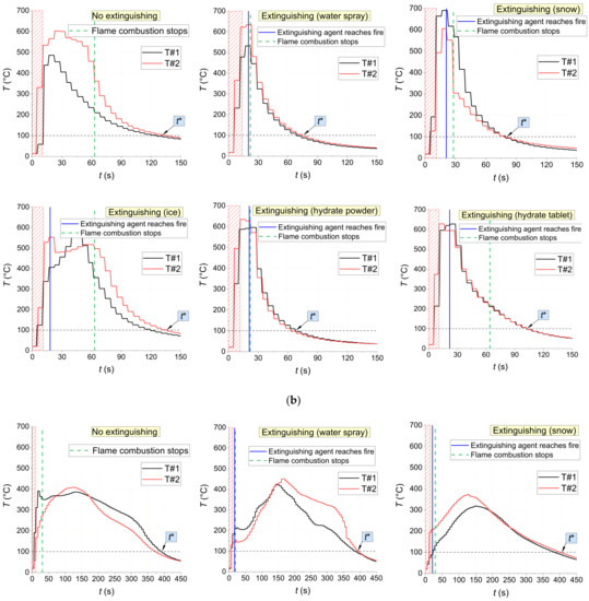Figure 18 shows the temperature trends obtained using thermocouples in the center of fires with and without being exposed to extinguishing agents (water spray, snow, ice, and CO2 hydrate tablet). There are distinct intervals of intense pyrolysis and combustion of materials, supply of extinguishing agents, as well as the fire containment and suppression. The non-monotonic sectors on the trends illustrate the highly unsteady nature of the combustion after ignition and suppression using a wide range of agents. The conditions of fire containment and suppression were provided in all the experiments: a temperature decrease below 100 °C in the near-surface and deep layers. The analysis of Figure 18 shows that CO2 hydrate powder provided the shortest time between the supply of the extinguishing agent and the moment when the flame combustion of the material stopped for all the laboratory-scale fires under study (1–5 s). Water aerosol was the second best extinguishing agent with 2–19 s. The worst result was obtained using ice: here, the flame quenching time was comparable to the one without extinguishing.