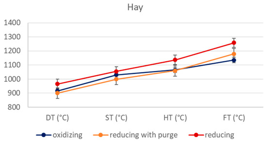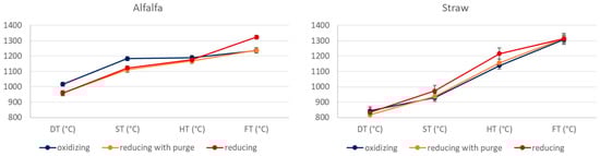 The highest measured FT has been observed in the alfalfa sample during the reducing atmosphere. However, the straw sample had also higher FT temperatures and more than 1300 °C for all atmospheres. Hay samples had higher measured FT value for reducing atmosphere, but less than 1300 °C. Horák’s results for FT temperatures are the following: 1300 °C during the reducing atmosphere and 1260 °C during oxidizing atmosphere for hay pellets [17], 1370 °C during the oxidizing atmosphere, and 1360 °C for ½ reducing and pure reducing atmosphere for wheat straw [15].