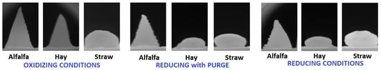 Figure 5 shows the individual shapes of tested samples during their melting at 1000 °C. Based on these records, alfalfa ash and hay ash were less deformed by heat during oxidizing conditions than during reducing conditions. Alfalfa ash had the greatest heat resistance, and straw ash had the lowest heat resistance, on the other hand.