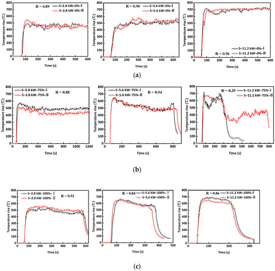 Evolution of peak temperature rise above the fire source in Tunnel-S at different sealing ratios (the time included 60 s prior to fire ignition). (a) Sealing ratio = 0%, (b) Sealing ratio = 75%, (c) Sealing ratio = 100%.