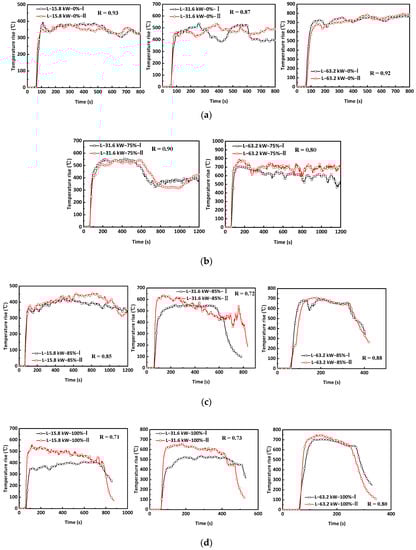 Evolution of peak temperature rise above the fire source in Tunnel-L at different sealing ratios (the time included 60 s prior to fire ignition). (a) Sealing ratio = 0%, (b) Sealing ratio = 75%, (c) Sealing ratio = 85%, (d) Sealing ratio = 100%.
