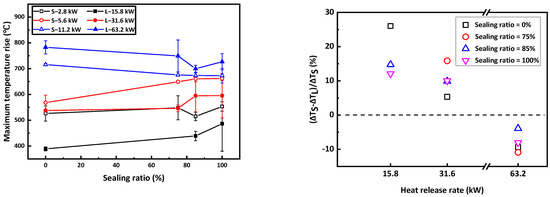 A comparison of the maximum temperature rises in the two tunnels with different sealing ratios is shown in Figure 5. The mean of the peak temperature rises in two repeated tests was taken as the maximum temperature rise. For fires with heat-release rates of 2.8 and 5.6 KW in Tunnel-S, the maximum temperature increased slightly with the sealing ratios. This may be due to the increase in the sealing ratio reducing the amount of smoke flowing out of the tunnel and, subsequently, leading to the accumulation of hot smoke in the tunnel. For fires with heat-release rates of 11.2 kW, the maximum temperature declined with the increase in sealing ratios, which was in contrast to the 2.8 and 5.6 KW fires. This may be due to the fact that the fire with a larger heat release was in under-ventilated conditions due to the sealing of the portals, thus, the incomplete combustion of fires led to lower temperature rises with larger sealing ratios. In Tunnel-L, the maximum temperature increased with the increase in sealing ratio for smaller fire sizes, i.e., 15.8 kW and 31.6 KW, and decreased with the increase in sealing ratios for larger fire sizes, i.e., 63.2 KW. The relationship between the maximum temperature rises and the sealing ratios in Tunnel-L agreed well with that in Tunnel-S. A further comparison was made between the difference in maximum temperature in the two tunnels as shown in Figure 5. At a 0% sealing ratio, the maximum temperature was approximately 520 °C for a 2.8 KW fire in Tunnel-S, whilst it was approximately 380 °C for a 15.8 kW fire in Tunnel-L. For both 2.8 kW and 5.6 KW fires at sealing ratios from 75% to 100%, the maximum temperature in Tunnel-S was approximately 5~26% higher than its counterpart in Tunnel-L. At varying sealing ratios from 0% to 100%, the maximum temperature in Tunnel-S was approximately 5~26% higher than its counterpart in Tunnel-L for smaller fire sizes, i.e., 2.8 kW and 5.6 KW, whilst the maximum temperature in Tunnel-S was approximately 5~10% lower than its counterpart in Tunnel-L for larger fire sizes, i.e., 11.2 kW.