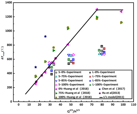 The equations on the maximum temperature rise under the ceiling proposed by Li et al. [26], as shown in Equation (2), were further compared with our results.