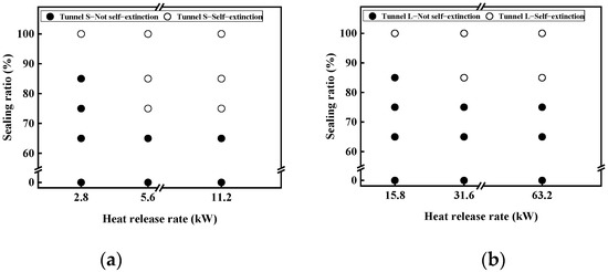Based on the findings of Shi et al. [18] in Tunnel-S, self-extinction occurred at a sealing ratio of 75% or above, except for a heat-release rate of 2.8 kW, for which self-extinction occurred only at a 100% sealing ratio. They concluded that the minimal critical sealing for the self-extinction of fires was 75%, as shown in Figure 7a.