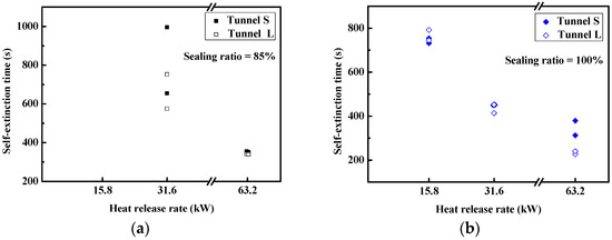 Comparison of the self-extinction time in the two tunnels. (a) sealing ratio of 85%, (b) sealing ratio of 100%.