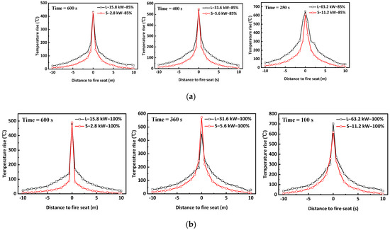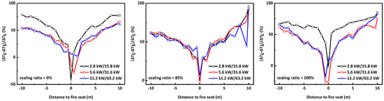 At an 85% sealing ratio, as shown in Figure 9a, the temperature rises for a 2.8 kW fire in Tunnel-S at 424 s and a 15.8 KW fire in Tunnel-L at 600 s were taken as the fires persisted for 20 min. In both Tunnel-S and Tunnel-L, the maximum temperatures were generally symmetrical on both sides of the fire seats as fires were located at the center of the tunnel. The temperature rises decreased with increasing distance away from the fire seat. However, it was noted that the temperature rises along the Tunnel-S were less than those along Tunnel-L. A similar pattern was observed when comparing 5.6 kW and 31.6 kW, and 11.2 kW and 63.2 KW. Therefore, the temperature rises along the reduced-scale tunnel were much less than those along the full-scale tunnel. Furthermore, it was noted that the temperature differences increased almost monotonously with distance away from the fire seat and they were as high as 70% at the tunnel portals, as shown in Figure 10. At a sealing ratio of 100%, the maximum temperature along the tunnel prior to the self-extinction of fires was taken for comparison, as shown in Figure 9b. A similar trend was observed, and the temperature rises along Tunnel-S were less than those along Tunnel-L, and the differences increased monotonously with distance away from the fire seat, irrespective of the sealing ratios and heat-release rates, as shown in Figure 10. Lin et al. [22] studied the similarity of scaling laws for tunnel fires with natural ventilation by using the same two model tunnels, and their experimental results demonstrated that the data deduced from the 1/2 tunnel based on scaling laws could lead to a significant under-estimation of the temperature rises along the tunnel with errors as high as 50~70%, except for those above the fire sources. The results for tunnels at varying sealing ratios were consistent with those with natural ventilation.