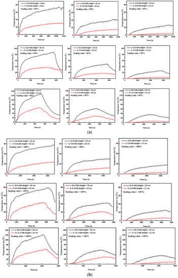 The experiment data from Huang et al. [11], Chen et al. [10] and Hu et al. [27] were included in Figure 6 for comparison. For low heat-release rates at different sealing ratios in both scales, the maximum temperatures above the fire seat prior to self-extinction in this study were agreeable with Equation (2), but they are much lower than in the data from Huang et al. [11] and Chen et al. [10]. For larger heat-release rates, the maximum temperatures in this study were much lower than the predicted values and other researchers, irrespective of the sealing ratios.