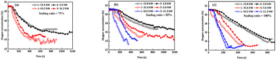 To further explore the detailed combustion characteristics of fires in the two tunnels, the evolution of oxygen concentrations close to the fire seats at different sealing ratios were quantitatively studied throughout the experiment, as shown in Figure 12. The measuring point in Tunnel-S was located 0.2 m away from the fire seats, 0.12 m underneath the ceiling in Tunnel-S, which corresponded to the point located 0.4 m away from the fire seats, 0.24 m underneath the ceiling in Tunnel-L. The gas concentrations and the times measured in Tunnel-S were converted for comparison to those in Tunnel-L based on the scaling law.