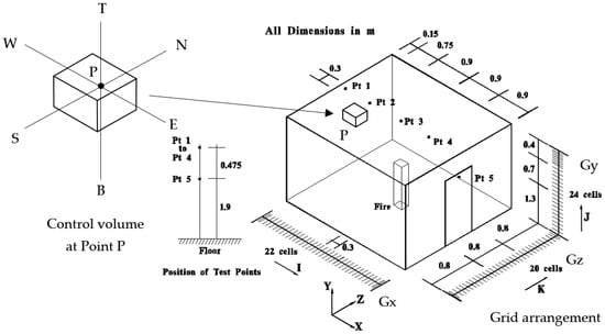 The chamber is divided into a coarse grid system of 22 × 24 × 20 cells along the directions x, y, and z, respectively, as shown in Figure 1. The grid boundary along each x, y, and z direction are shown in lines Gx, Gy, and Gz in the figure. Note that the y co-ordinate is taken to be the vertical direction. For a better simulation, the grid sizes are not uniform. The fire source and some critical locations are modeled with smaller grids. The locations of the monitoring points are shown clearly. A personal computer notebook can be used for the simulation. The time step was 0.1 s. The convergence criterion for solving all flow variables ϕ is: