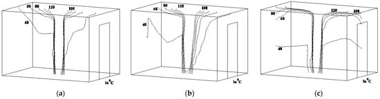 Predicted temperature fields using (a) Tu 1, (b) Tu 2, and (c) Tu 3.