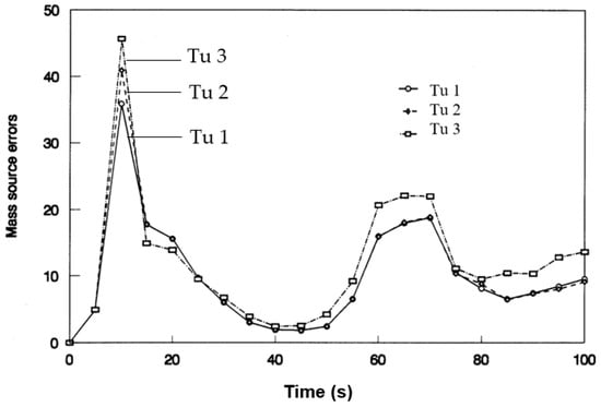 The mass source errors at 100 s for Tu 1, Tu 2, and Tu 3 are 9.5, 9.1, and 13.6, respectively. Higher mass sources are expected because combustion is not simulated. The turbulent flow was still under transition. The transient values are plotted in Figure 5.