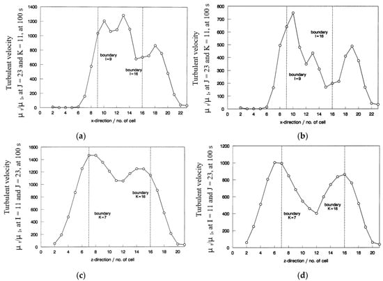 The viscosity ratio () along the x-axis for J = 23 and K = 11 by Tu 2 and Tu 3 were plotted in Figure 7a,c. The variations of viscosity ratio () along the z-axis for I = 11 and J = 23 by Tu 2 and Tu 3 are shown in Figure 7b,d.