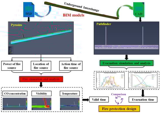 The entire study design is illustrated in Figure 1, including the modeling of underground interchange, fire characteristics, and evacuation simulations. Details are described in the following sections.