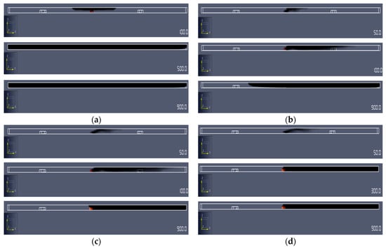 Front view of flue gas development with different longitudinal ventilation velocities. (a) 0.5 m/s, (b) 3.0 m/s, (c) 3.6 m/s, (d) 4.0 m/s.
