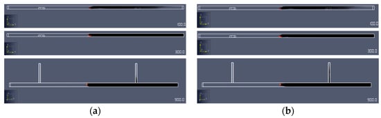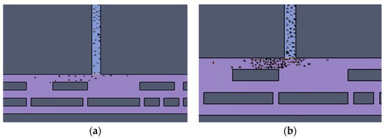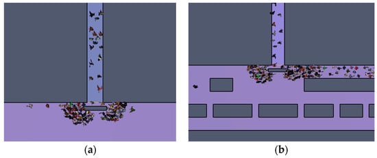 A 3 m by 0.5 m obstacle was set up 0.5 m in front of the PASS1 and PASS2 entrances to simulate obstructions blocking the transverse passage entrance. According to the simulation results that are presented in Figure 20, compared with the situation without debris, the time for all people to enter the safe area increased by 19.3%, and the time for all people to escape increased by 19.6% under moderate congestion. Furthermore, in heavy congestion, these two times increased by 45.9% and 34.0%, respectively. Therefore, it is necessary to regularly check and clean up the obstacles outside the entrance of the transverse channel to ensure the normal use of the transverse channel.