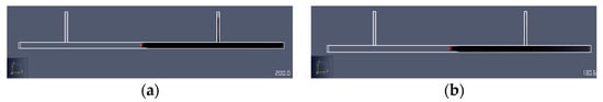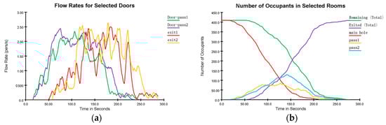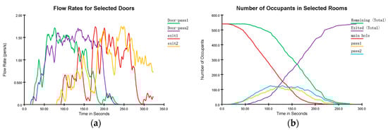 Working condition #1 was simulated, as shown in Figure 17. People started to enter PASS1 and PASS2 at 21 s and 17 s, respectively. They entered all the above positions at 218 s and 211 s, respectively. Namely, no people were on the main line, and everyone was relatively safe. The personnel began to arrive at the escape exit at 60 s and 56 s, respectively, and all left the exit at 277 s and 270 s, respectively. That is, at 277 s, all the personnel successfully escaped.