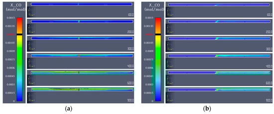 Changes in the longitudinal center section of the CO concentration: (a) 0.5 m/s; (b) 3.6 m/s.