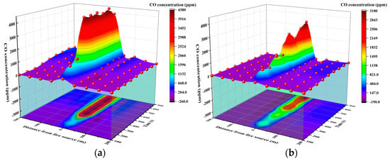 Figure 8 shows the changes in the longitudinal center section of CO concentration at different distributions. Furthermore, Figure 9 describes the 3D curves of CO concentrations at different distances. The small longitudinal and critical ventilation velocities were 0.5 m/s and 3.6 m/s, respectively.