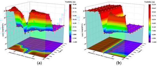 3D curves of visibility with time and distance: (a) 0.5 m/s; (b) 3.6 m/s.