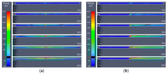 Changes in the longitudinal center section of temperatures: (a) 0.5 m/s; (b) 3.6 m/s.