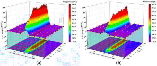 Three-dimensional curves of temperature with time and distances: (a) 0.5 m/s; (b) 3.6 m/s.