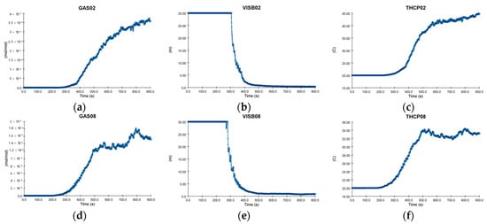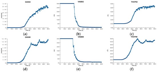 Change curves of fire characteristics under working condition B: (a–c): left transverse passageway; (d–f): right transverse passageway.