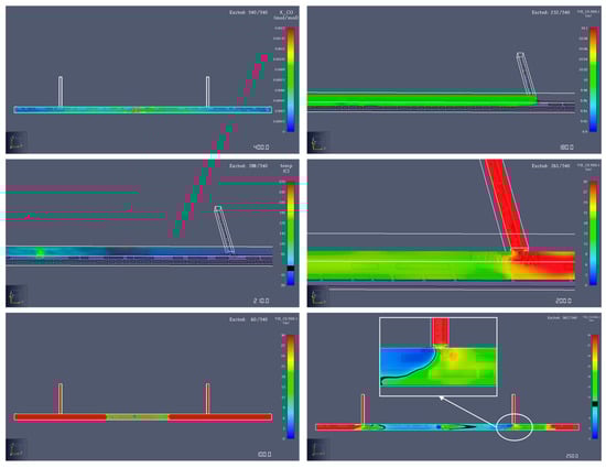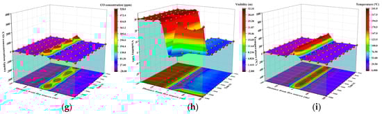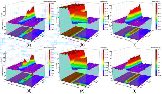 Depending on the results in Table 1, working condition #1 and working condition #7 met the set requirements of fire simulation. In the evacuation process of other working conditions, the visibility reduction caused by smoke diffusion is the main factor affecting evacuation. Strayed personnel may be at risk in other working conditions due to poor visibility. Taking working condition #6 as an example, the 2D slice and 3D cloud views of the simulation process are displayed in Figure 21. It can be intuitively seen that the value of CO concentration and temperature rose slowly, which had little influence on the escape of personnel in each working condition, while with the passage of time, the visibility was undeniable and was below the critical value after 200 s, which was the main factor affecting people’s escape.