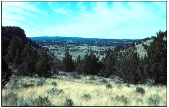 The successional transition of sagebrush shrub steppe into mature western juniper woodlands has been described in three phases [4]. In Phase I, the juniper trees are small, widely spaced and generally have only minor influences on ecological processes. Herbaceous and shrub components remain relatively intact and are minimally affected by the few and young juniper trees. In Phase II, the trees and understory shrub and herbaceous layers are co-dominant. The juniper trees are beginning to influence the site’s composition and ecological processes. In Phase III, juniper dominates the site’s composition and ecological processes. Many shrub steppe species have declined on the site and will continue to decline as the woodland develops. Mature woodland is dominated by juniper and sometimes pine species. Understory shrub and herbaceous species coverage is diminished from the shrub-steppe-dominated state due to competition with trees for light and other resources. Bare ground in the tree interspaces is common. The tree component often has a mixed age and size structure, but a majority of the site’s plant coverage consists of mature trees. Total tree cover varies by region and soil type but usually exceeds 30%. The age of these mature trees often exceeds 400 years, and some individuals may be over 1000 years old. Landscapes are frequently a mosaic of different phases, mature western juniper and sagebrush steppe (Figure 1).