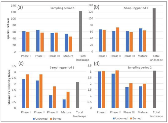 Total species richness (a,b) and diversity (c,d) for each woodland development stage (unburned and burned) and for the total landscape for the two sampling periods.