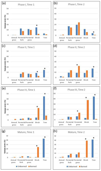 Comparison of canopy cover of functional plant groups between burned and unburned plots by woodland development phase and sampling period. Significant differences (p < 0.05) in cover between burned and unburned plots are marked with a star (*).