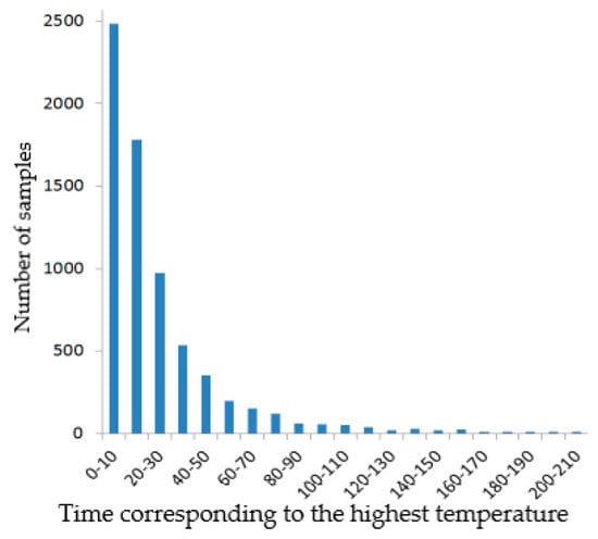Figure 9. The highest temperature occurred most frequently within the range of 1100–1200 °C. The mean and standard deviation of the highest temperature were 873.3 °C and 286.3 °C, respectively.