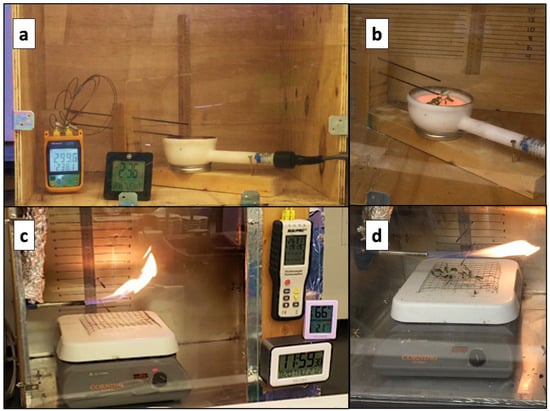 | Direct Flame | Samples are directly ignited by an open flame without any other heat source present. The open flame varies across studies from a Bunsen burner to a larger U-shaped gas burner. | [19], [127,128], [132], [155,156] |