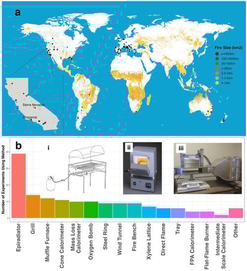 | Steel Ring | This is similar to the ‘tray’ method, but it involves a more sophisticated setup to maximize airflow and can incorporate both leaf litter and/or vegetation samples. It involves a steel mesh ring with samples loaded into it. Often, it also has a fireproof base, such as one made from a hardiflex cement fiber board. Ignition sources vary, including a paper towel soaked in isopropyl alcohol and a cotton ball soaked in ethanol. | [129,130,131,132,133,134,135,136,137] |