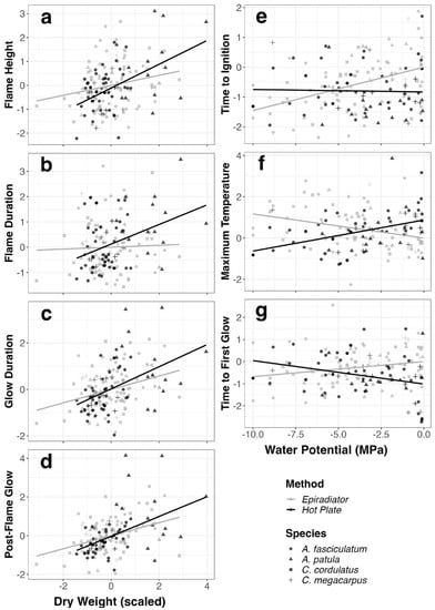 4.2. How Do the Methods Compare When Analyzing the Relationships between Plant Hydration, Sample Dry Weight, and Flammability?