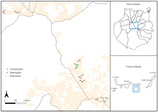 The Canary Islands archipelago, Gran Canaria Island and plot location (red for burned (B) plots and green for control (C) plots). The distribution of the pine forest is in shadow.