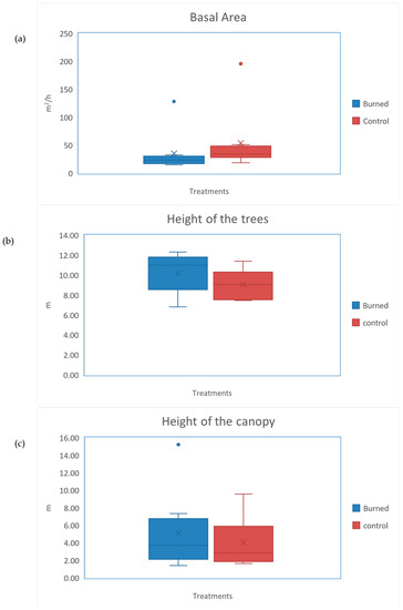 (a) Box plots of basal area values for the 8 plots of the burned and control treatments; (b) average height of the trees; (c) canopy height.
