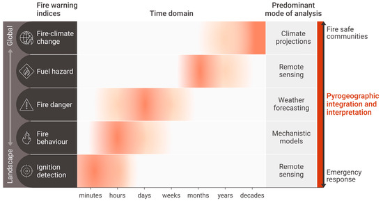 Broadly, there is a continuum from very detailed fire observations and predictions (e.g., wildfire fire detection and monitoring, fire behaviour modelling, fire weather forecasting) to a more general assessment of likely fire activity at regional and global scales [3]. Local near-term assessments of fire danger are essential for emergency responses, while regional and longer-term assessments provide a lead time for communities to adapt to changing fire risks (Figure 1).