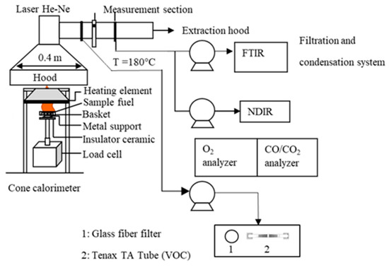 The exhaust gases of combustion were sampled from the exhaust ducts of the cone calorimeter and passed through four different measurement systems. The first measurement system consists of an Antaris Industrial Gas System (IGS) FTIR-based analyser from Thermo Fisher Scientific. The FTIR spectrometer obtained the molar fractions of CO2, CO, CH4, NO, NO2, NH3, C2H6, C2H4, C2H2, C3H8, C3H6, C4H6, C6H6, HCHO, CH3CHO, SO2 and H2O. A filter removing the aerosols (0.45 µm pores) was placed before the gas cell and the sampling line and was heated at 180 °C to avoid condensation. The spectrometer was equipped with an MCT-A detector and a gas cell measurement with a volume of 0.2 L and an optical path length of 2 m. IR spectra were recorded in the spectral range of 4500–550 cm−1 with a 0.5 cm−1 resolution. The flow rate of the sampling pump was adjusted to 3.5 L/min. The identification of the compounds by FTIR was carried out from a bank in which the products resulting from the combustion are listed. Calibration verification is performed once a year by a maintenance engineer from Thermo Fisher. The second measurement system consists of non-dispersive infrared (NDIR) spectroscopy. This apparatus was used to quantify continuously CO and CO2. Each day of analysis, NDIR analysers were calibrated with two points of measurement. The first point corresponds to a gas without CO and CO2. For this, almost pure N2 (99.995% i.e., 4.5) was used. For the second point, a mixture containing 2500 ppm of CO and 8% CO2 was used. These measurements performed a double check on the CO and CO2 data recorded by the FTIR. The third system is an automatic thermal desorption gas chromatography–mass spectrometry apparatus (DTA/GC/MS) for VOC identification and quantification. A sample pump with a flow rate of 1.4 L/min was used to collect VOCs with Tenax tubes (Supelco®, Saint-Quentin-Fallavier, France). Upstream of the pump, glass fibre filters, type A/E (DOP efficiency is 99.98% at 0.3 µm), were used to prevent aerosol from penetrating the Tenax TA tube. Since the sampling took place in the smoke extraction pipe, where the flow rate was 24 L/s, a multiplicative factor of 720 was used to calculate the emission factors. At least three tests were carried out to ensure reproducibility for each slab. The Tenax TA sorbent tubes used for the analyses had the following dimensions: 115 mm × 6 mm outer diameter (o.d.) × 4 mm inner diameter (i.d.), in order to capture the organic compounds (C5-C30). The analyses were performed by thermal desorption using the DTA-GC/MS. It should be noted that sorbent tubes have previously been used in other studies for sampling VOCs and SVOCs [32,33] before GC/MS analysis.