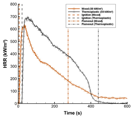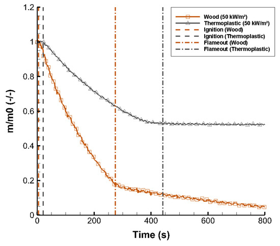 where E is equal to 13.00 MJ/kg for wood and 12.39 MJ/kg for thermoplastic and corresponds to the heat release per unit mass of O2 consumed,nd represent, respectively, the molar flow rates of O2 in the incoming air and in the exhaust duct and is the molecular weight of oxygen. More details on HRR measurement are given in a previous study [30].