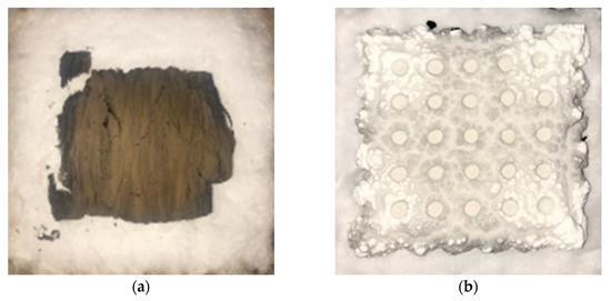 At the end of the tests, 2.67 (±1.47)% and 52.7 (±0.7)% of the initial mass for the wood and thermoplastic samples remains, respectively. For wood, the residue corresponds to ashes (Figure 3a). For the thermoplastic samples, the residue is white and friable and corresponds to the calcium carbonate used as filler (Figure 3b). This result reveals that all of the fuel mass corresponding to the thermoplastic has been consumed.