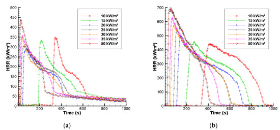 Heat Release Rate (HRR) as a function of time for imposed heat fluxes ranging from 10 to 50 kW/m2 for (a) wood and (b) thermoplastic samples.