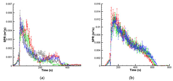 Combustion of the thermoplastic is very repeatable, allowing us to burn only three samples as opposed to five for wood. Figure 7a,b show the measured SPR versus time for the different imposed heat fluxes for the wood and thermoplastic samples. Each curve represents a single experiment for each flux. Adjustments were made to have the same time origin for all curves. During flaming, both the peak SPR and the area under the curve increase with heat flux, reflecting an increase in aerosol production quantified in Section 3.3.1. The peak SPR itself increases with flux from 0.005 to 0.019 m2/s for wood and from 0.006 to 0.03 m2/s for thermoplastic. As the heat flux increases, the first peak becomes indistinguishable as the duration of the ignition phase increases. In addition, the duration of the pre-ignition phase is shortened by faster ignition as the imposed heat flux increases. The peaks of SPR noted in the literature [27] are similar to those obtained in our study: 0.01–0.03 m2/s for wood flooring and 0.010–015 m2/s for PVC flooring.