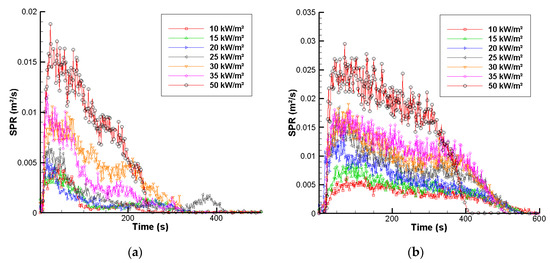 Smoke Production Rate (SPR) as a function of time for different imposed heat fluxes for (a) wood and (b) thermoplastic samples.